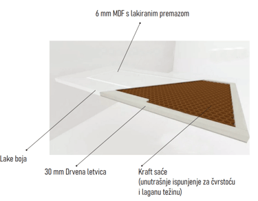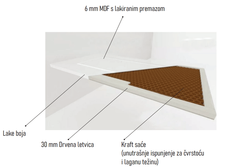 Naši krilni dijelovi vrata imaju standardnu debljinu od 42 mm, (izrađeni su od 30 mm jele ili smrče kao nosač, ispunjeni kraft-saćastom strukturom i obostrano obloženi s 2×6 mm MDF-a).